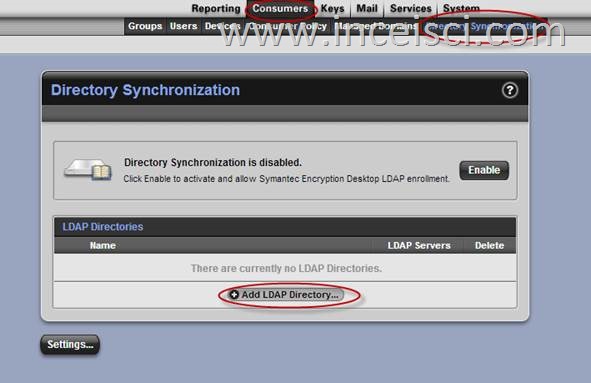 PGP Universal Server Web Arayüzünehttps://pgpus.symlab.com:9000 adresine eriştikten sonra kullanıcı adınızıveparolarınızı yazarak sistem’e login olunuz. Menu’den Consumers’I seçiniz. Açılan alt menu de Directory Synchronization’ı seçtikten sonra gelenekran da Add LdapDirectory’Iseçiniz.