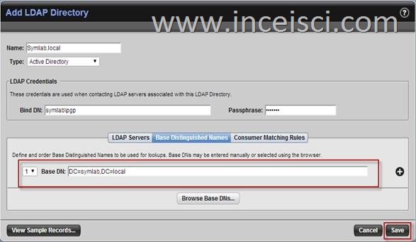 Base Distinguished Names’I seçtikten sonra Browse Base DNS..’i seçiniz. Browse Base Distinguished Names’den size ait Domain’i seçeriz veya “DC=symlab.com,DC=local” Domain adını yazarak save ederiz.