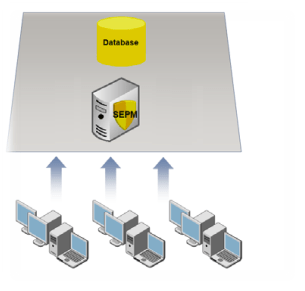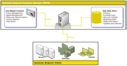 Symantec Endpoint Protection’un sisteminin ana bileşenleri aşağıda gördüğnüz gibi Symantec Endpoint Protection Manager , Symantec Endpoint Protection Database , Symantec Endpoint Protection Manager Console ve Symantec Endpoint Protection Client’lerinden oluşmaktadır.