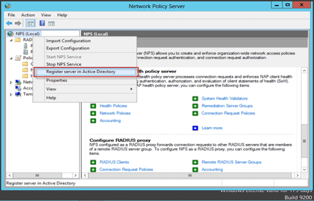Kurulum işlemleri bittikten sonra aşağıdaki gibi NPS Server Active Directory’e kayıt edilmelidir.
