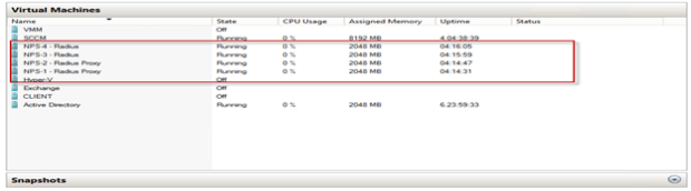 • Windows Server 2012: Network Policy Server Hyper-v üzerinde 4 adet Windows Server 2012 Datacenter edition kurulmuştur. 2 Adet Sunucu NPS Radius 2 adet sunucuda NPS proxy olarak kullanılacaktır.