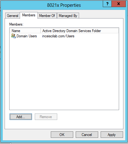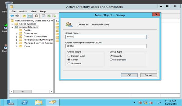 - Active Directory Üzerinde 8021x diye Security grubu yaratılmalıdır. 8021x uygulanacak bilgisayarlar bu gruba üye yapılmalıdır. Kullanici bazlida yapilabilmektedir.