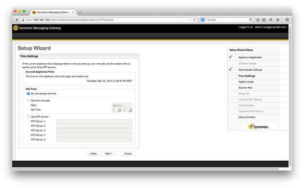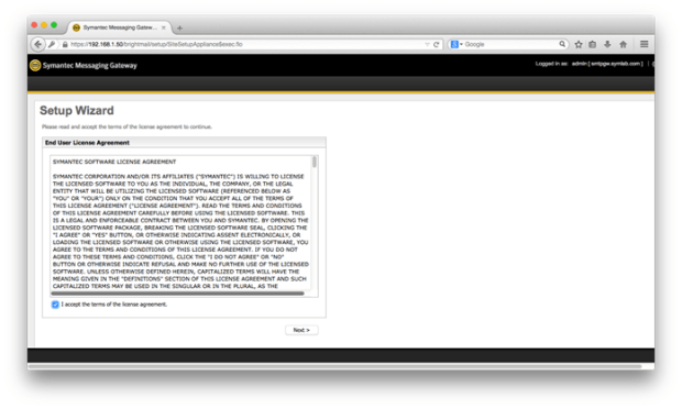 Administrator mail adresini yazıyoruz. SMG’nin default da açık olan alarm ve uyarı mailleri bu adrese gidecektir. “Next” diyerek kuruluma devam ediyoruz.