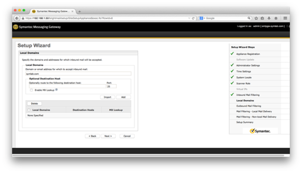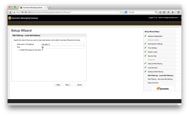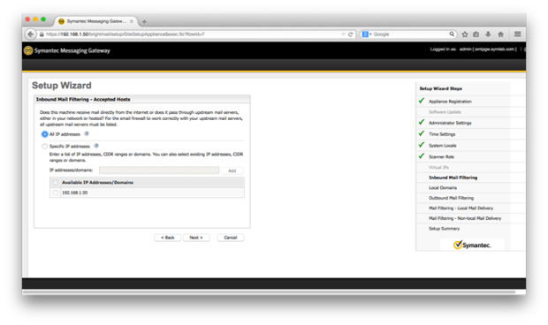 Inbound Mail Filtering de Dış Dünyadan SMG’ye gelecek olan maillerin hangi Ethernet ve port’dan geleceğini seçiyoruz. “Next” diyerek kuruluma devam ediyoruz.