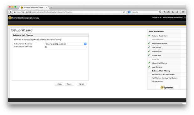 Outbound Mail Filtering’de SMG’nin dış dünyaya mail gönderirken kullanacağı Ethernet ve portu seçiyoruz. “Next” diyerek kuruluma devam ediyoruz.