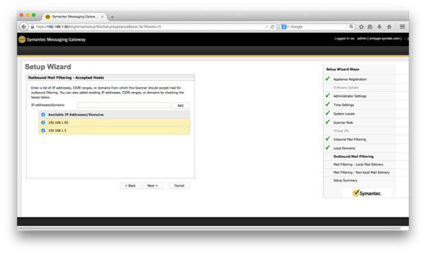 SMG üzerinden dışarıya mail gönderen sunucuları tanımlıyoruz. Mail sunucularımızın Ip adreslerini ekliyoruz. Avaibable Ip Addresses/ Domain’i seçiyoruz. “Next” diyerek kuruluma devam ediyoruz.