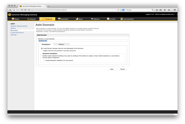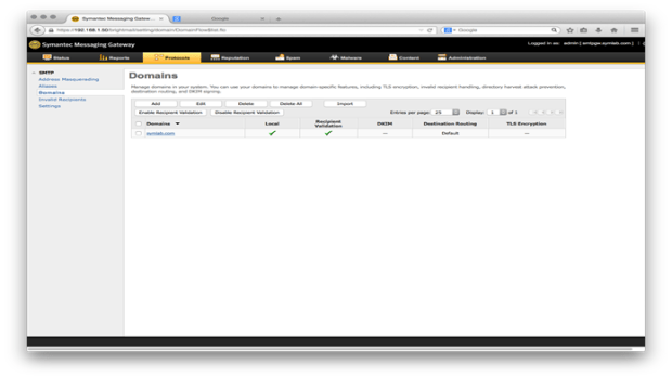 Symantec Messaging Gateway üzerinde birden fazla domain tanımlanabilmektedir. Domain eklemek için Protocols>Domains’den “Add” diyerek ekleme işlemine başlıyoruz.