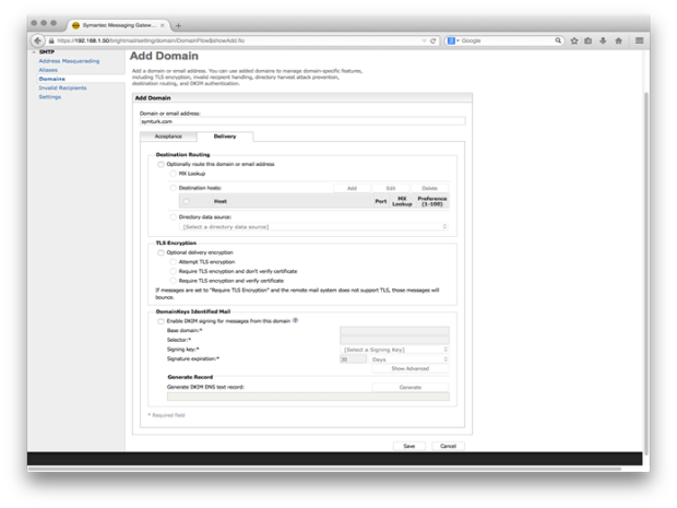 Eklediğimiz domain farklı bir mail sunucu da ve farklı bir directory kullanıyor ise “Delivery” sekmesinden ilgili ayarlamaları yapılandırmalıyız. TLS ve DKIM ayarlamalarını buradan yapabiliriz. İlerleyen konularda TLS ve DKIM ayarlamalarını yapacağız. Şimdilik burada herhangi bir değişiklik yapmaya gerek yok. Save diyerek konfigürasyonu kaydediyoruz.