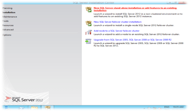 SQL Server kurulum CD’si ile kurulum başlatılır. “New SQL Server Stand-Alone Installation or add features to an existing installation” seçilerek kuruluma başlanır.