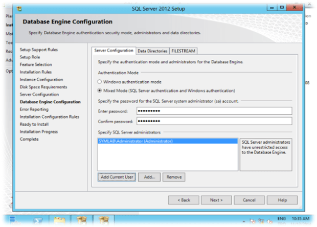 Server Configuration’da Authentication Mode’u seçiyoruz. SEE Windows ve Mixed Authenticationların desteklemektedir. Burada Mixed seçiyoruz. Passwordleri yazdıktan sonra “Add Current User” ile Windows’a Logon oldugumuz kullanıcıyıda ekliyoruz. Data Directories yapılandırmasında SEE’in database dosyalarının yerini belirtiyoruz. Next diyerek kuruluma devam ediyoruz
