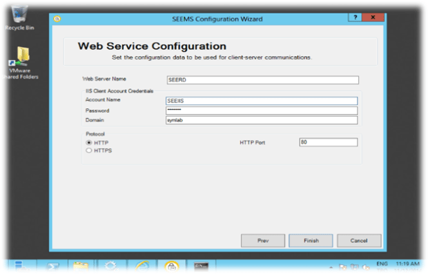 Web Service yapılandırmasında Client ile Management Server haberleşmesi için kullanacağı port ve protokolleri seçiyoruz. Domain üzerinde SEE Clientlarin Management sunucu ile iletişime geçmlerinde kullanacak bir hesap açıyoruz o hesabnın bilgilerini buraya yazıyoruz. Finish diyerek yapılandırmayı tamamlıyoruz.