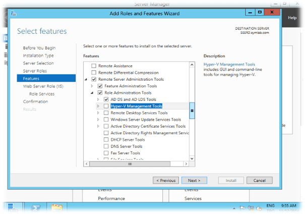 Features ekranında .NET 3.5 ve .NET 4.5, Group Policy Management ve Remote Server Administration Tools > Role Administration Tools’dan AD DS and AD LDS Tools’u seçiyoruz. Next diyerek kuruluma devam ediyoruz.