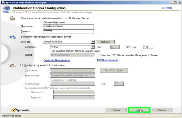 Notification Server’e login olacağımız Username ve Password’u yazıyoruz. Ben Domain de SEPIC kullanıcısı oluşturdum kurulum yaptığım bilgisayarda SEPIC kullanıcı local admin haklarına sahip. SEPIC sunucusu üzerinde başka web hosting yok ise Default Web Site kalabilir. “Next” diyerek devam ediyoruz.