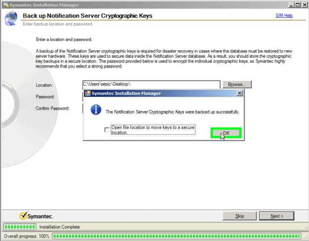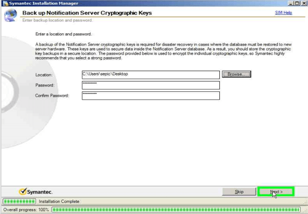 Kurulum tamamlandıktan sonra Notification Server Key’in yedeğini almak istiyorsak kaydedeceğimiz yeri ve şifreyi yazıyoruz. “Next” diyerek devam ediyoruz.