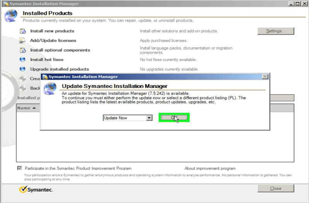 Symantec Installation Manager’in yükleme işlemi tamamlandıktan sonra Internet üzerimdem güncellemelerinin olup olmadığını kontrol eder eğer güncelleme var ise “OK” diyerek güncellemeyi yapıyoruz.