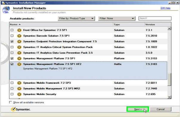 Install New Produc Ekraninda “Available producs” “Filter:None” olarak ayarlıyoruz. Symantec Endpoint Protection Integration Component , Symantec Management Platform 7.5 SP1 ve HF2’yi seçiyoruz. Next diyerek kuruluma devam ediyoruz.