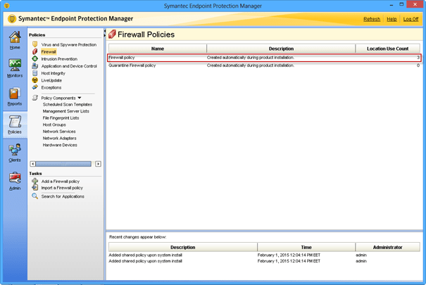 Symantec Endpoint Protection Manager Konsoluna giriş yaptıktan sonra Policies>Firewall seçiyoruz. Firewall Policies’de politikayı seçip düzenliyoruz.