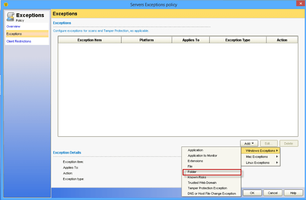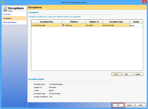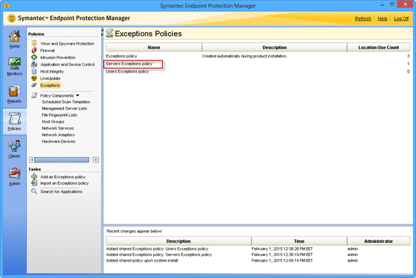Symantec Endpoint Protection Manager Konsoluna giriş yaptıktan sonra Policies>Exceptions seçiyoruz. Exceptions Policies’de Bilgisayar veya Sunucular için daha önceden hazırlamış olduğumuz politikaları görüyoruz. Bu örnekte Sunucular için istisna yazacağımız için Servers Exceptions Policy’i seçip düzenliyoruz.