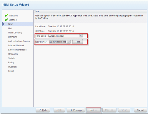 - Sunucunun Time Zone ve NTP Server yapılandırması yapılmalıdır. Networkunuz de NTP Server var ise o yazılmalıdır. “Next” diyerek devam edilir, sonraki ekranda konfigurasyon test gelmektedir. Yapılandırma doğru erişim var başarılı olacaktır.