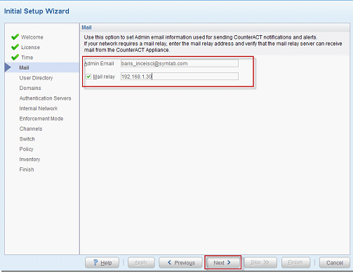 - CounterACT cihazının Zamanlanmış raporları, alarmları vb. İşlemleri e-posta atabilmesi için konfigurasyonları yapıyoruz. Admin E-mail e-postalarin hangi adrese gönderileceğidir. Sonraki ekranda konfigurasyon test gelmektedir. Yapılandırma doğru ve erişim var başarılı olacaktır.