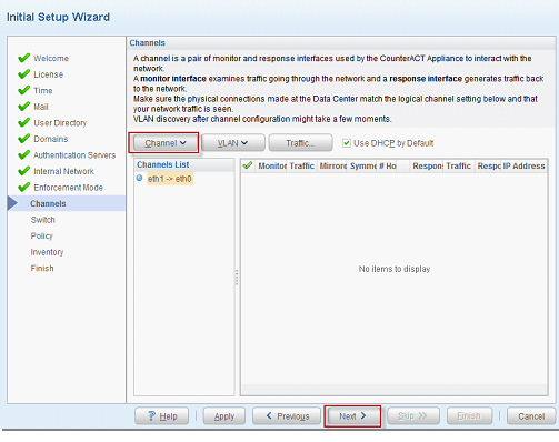 - Channels bölümünde cihaza bağlı ethernetlerin mirror ve response portlarını eklenir. Birden fazla vlan var ise vlan’larını vlan bölümünden aktif edilir. “Next” diyerek devam edilir.