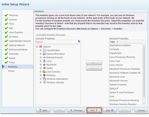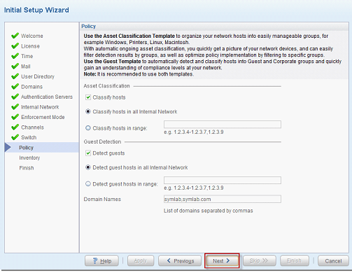 - Default Politikalar isteğe bağlı olarak aktif edilebilir. Asset Classification Ağınızda bulunan cihazları sınıflandırır. Guest Detection ise Ağınızda bulunan domainde olmayan bilgisayarları tespit eder. “Next” diyerek kuruluma devam edilir.