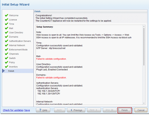 - CounterACT cihazının kullanıcı bilgisayarlarına bağlanıp bilgi toplayabilmesi için (Windows Güncelleme, Antivirus,Inventory vb) ve belli komutlar çalıştırarak iyileştirme yapabilmesi için bilgisayarlar üzerinde local administrator yetkisine sahip domain hesabı yazılmalıdır. Sonraki ekranda konfigurasyon test gelmektedir. Yapılandırma doğru ve erişim var başarılı olacaktır.