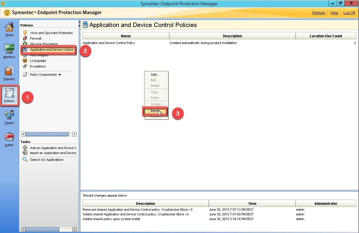 1-) Symantec Endpoint Protection Manager’e giriş yaptıktan sonra Policies>Application and Device Control bölümünden indirilen “Cryptolocker Block v3.dat” dosyasını aşağıdaki gibi import ediyoruz.