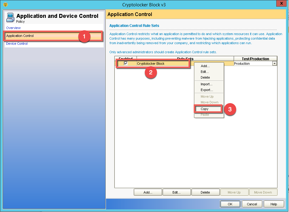 3-) Açılan bölümünde “Application Control” sekmesinden “Cryptolocker Block” Politikasını “Copy” diyerek kopyalıyoruz. Sonrasında Cryptolocker Block v3 politikasını kapatıyoruz.
