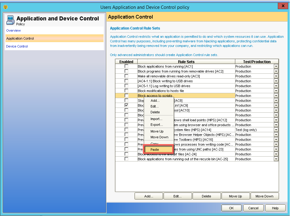 5-) Açılan bölümünde “Application Control” Sekmesinde Rule Set’lerin olduğu bölümde sağ tuş yaparak “Paste” diyoruz.