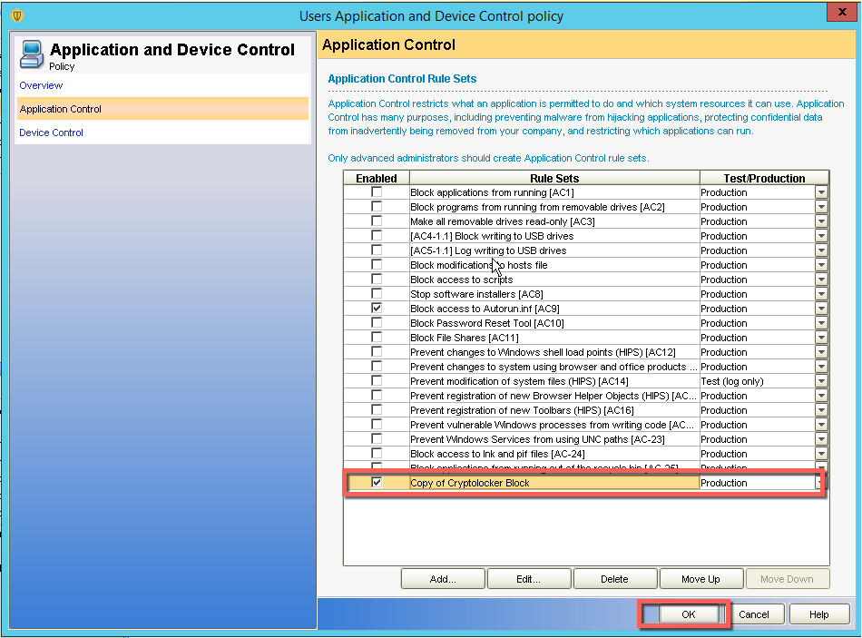 6-) Son olarak uygulanan politika en altta “Copy of Cryptolocker Block” olarak eklenmiş olacaktır. Ok diyerek politikayı aktif etmiş oluyoruz.