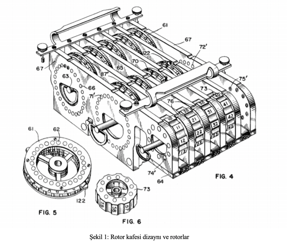 Şekil-1’de SIGABA patenti[3]’nden alınan rotor kafesi ve rotorlar görüntülenmektedir. FİG.5 ile belirtilen şifreleme ve kontrol için kullanılan rotor yapısını tasvir ederken , FİG.6.’da indeks rotor yapısı tasvir edilmiştir.