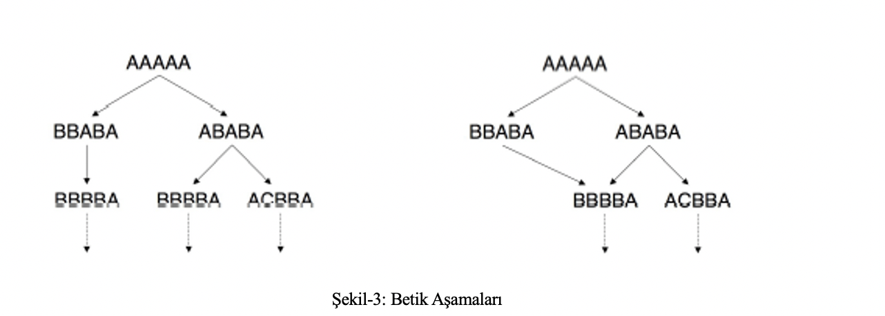 Şekil-3’de 1. aşama metin betiği AAAAA, 2. aşama metin betiği BBABA ve ABABA olarak örneklenmiştir. Şekil-3’de gösterildiği gibi 3. aşama betiğe 2. aşama farklı betik yollarından da ulaşılabilmektedir.