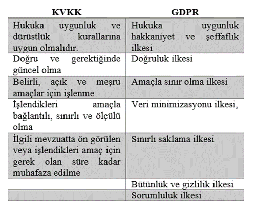 Kişisel Verileri Koruma İlkeleri Bakımından 6698 sayılı Kanun ile Genel Veri Koruma Tüzüğü Karşılaştırma tablosu Tablo 1’de gösterilmiştir.