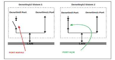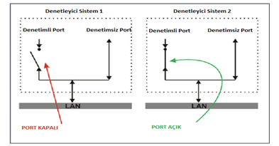 Bu güvenli bağlantı yöntemine port tabanlı kimlik kanıtlama denilmektedir. Çünkü, Kimlik kanıtlayıcı cihaz hem denetimli hem de denetimsiz portlarla uğraşır. Denetimli port ve denetimsiz port mantıksal varlıklardır (sanal portlar); ama yerel ağa aynı fiziksel bağlantıyı kullanırlar. Bu yapı Şekil 2’de gösterilmiştir.