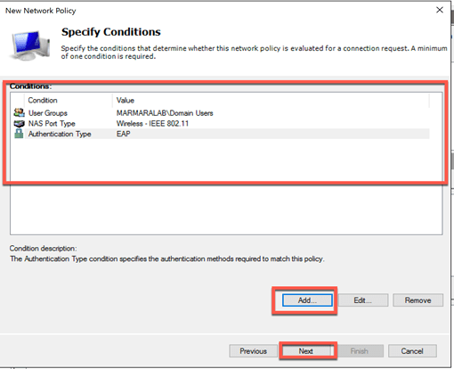 Specify Conditions bölümünde bu politikanın hangi koşullarda uygulanacağını seçiyoruz.