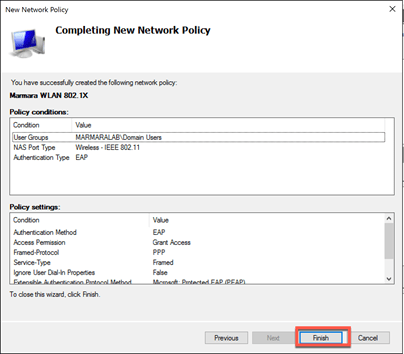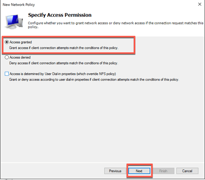 Specify Access Permission bölümünde koşulları sağlayan cihazlar için ağ üzerinde erişim vermek için “Access Granted” seçilir. Next seçilerek yapılandırmaya devam edilir.