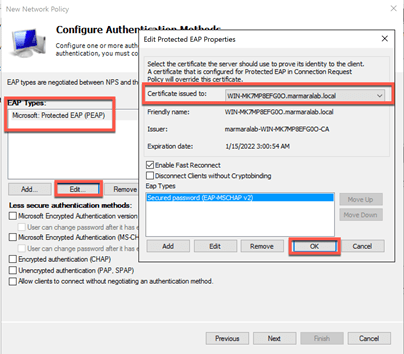 Authenticaiton Method’u PEAP olarak seçiyoruz. OK seçilerek yapılandırmaya devam edilir.