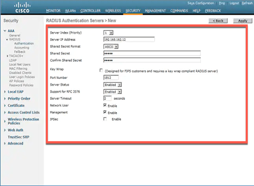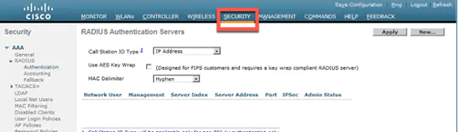 Cisco Wireless Controller (CWLC) web ara yüzüne giriş yapıldıktan sonra Security sekmesine gidilir. Radius menüsünden Authentication bölümünden New seçilerek yeni Radius server eklenmesi yapılır.