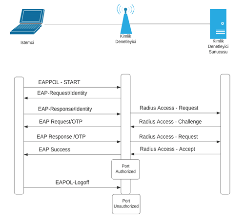- Kimlik doğrulaması yapmak isteyen istemci ve kimlik denetleyici sunucusu arasında bulunan denetleyici cihaz, bağlantı durumunda istemciye EAP Request / Identity paketi göndererek kendisini tanıtmasını ister.