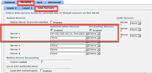 Gelen ekrandan Security sekmesinden AAA Servers’dan daha önce oluşturulan Radius Server seçilir.
