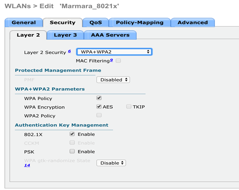 - Authentication Key Management: 802.1X seçilerek enable edilir.