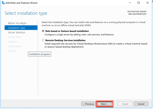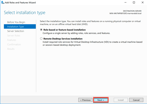 Role-base or feature bases installation seçilir. Next seçilerek kuruluma devam edilir.