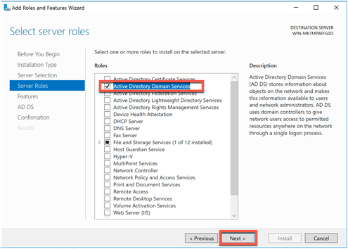 Select Role bölümünde “Active Directory Domain Services” seçilir. Next seçilerek kuruluma devam edilir.