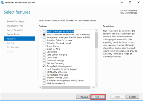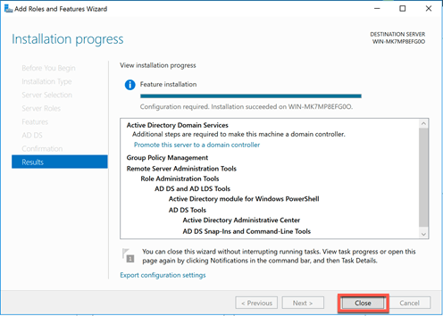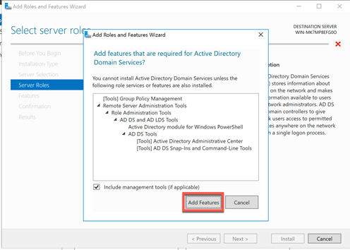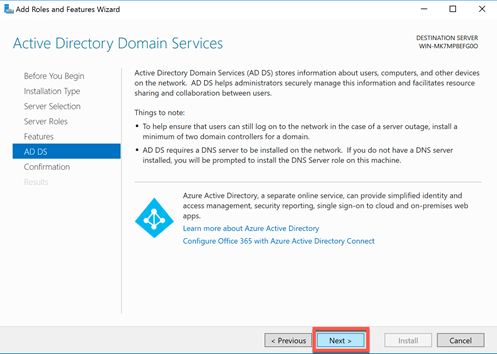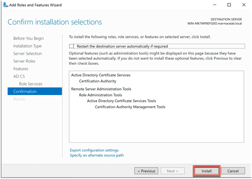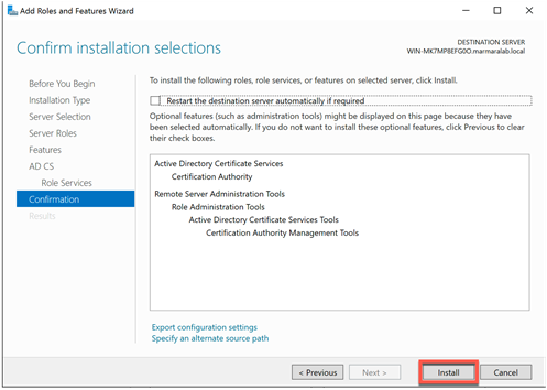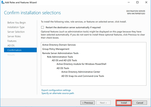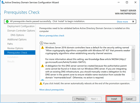 Install seçilerek Active Directory servisinin kurulumu başlatılır.