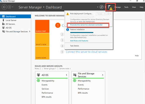 Server Manager bölümünden “Promote this server to a domain controller” tıklayınız