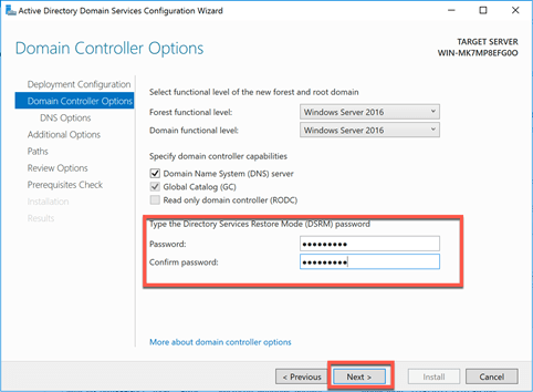 Active Directory Restore Mode parolası belirlenir. Next seçilerek yapılandırmaya devam edilir.