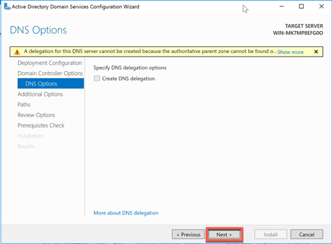 DNS kurulumunun da Active Directory yapılandırmasıyla yapılacaktır. Next seçilerek yapılandırmaya devam edilir.