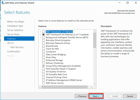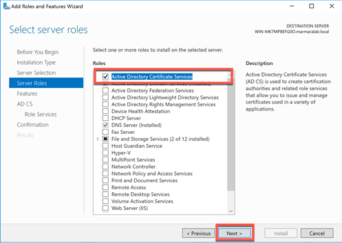 Server Role bölümünden “Active Directory Certificate Services” seçilir. Next seçilerek kuruluma devam edilir.