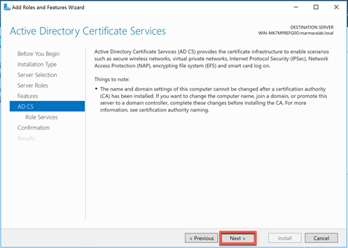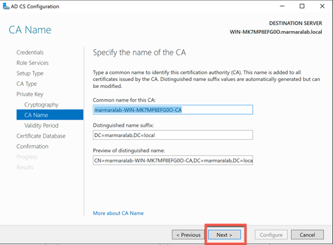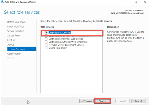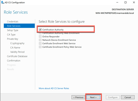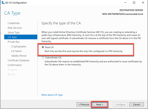 Root CA seçilir. Next seçilerek yapılandırmaya devam edilir.